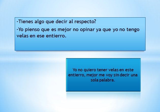 Ejemplos:-Camila siempre se quiere meter en mis problemas, como si tuviera velas en el entierro.-Mi madre siempre me dice que yo no tengo velas en el entierro, cada vez que doy mi opinión en alguna de las conversaciones que ella tiene con sus amigas.Así que, si no queremos que alguien nos diga esta expresión, es mejor no opinar ni meternos en asuntos que no nos incumben.